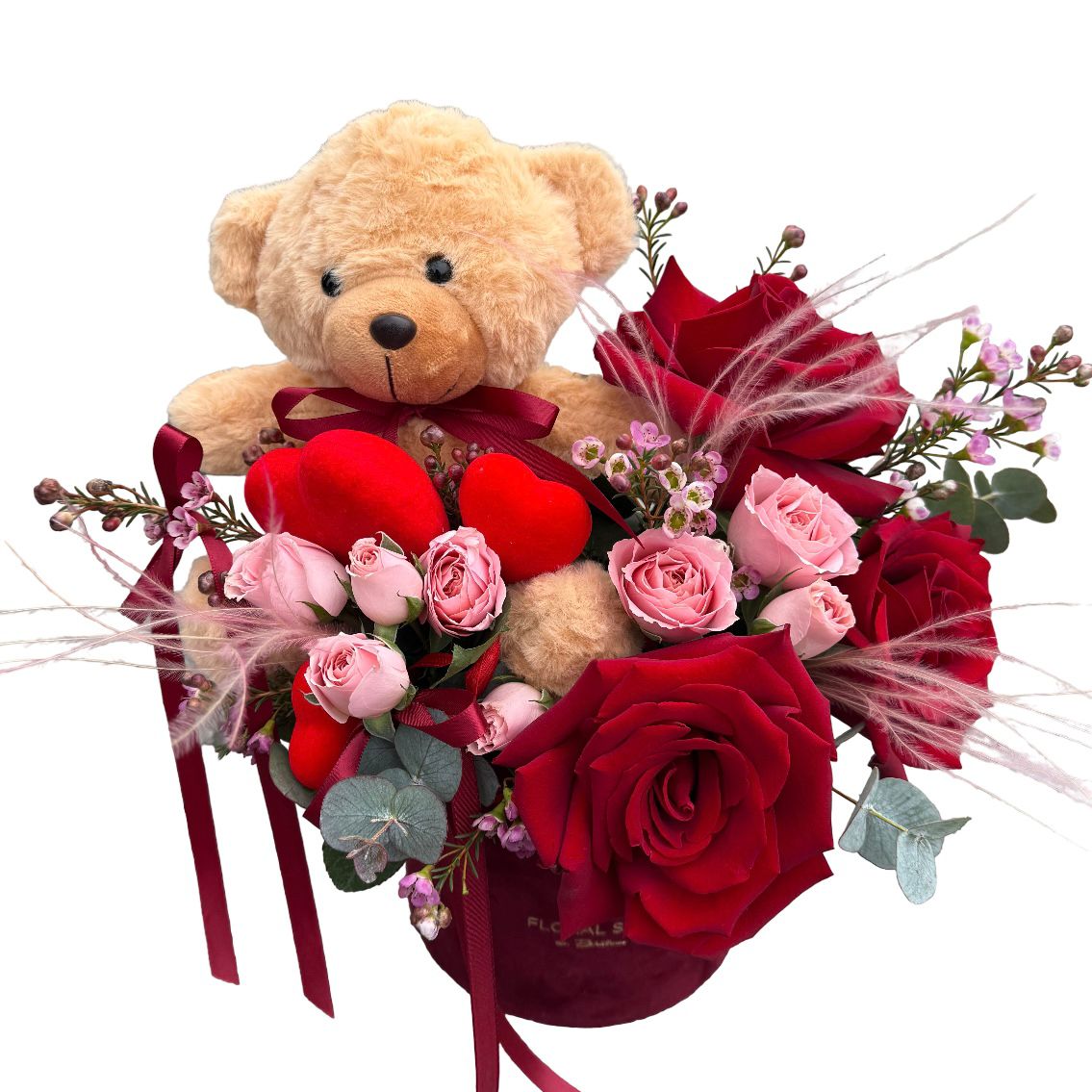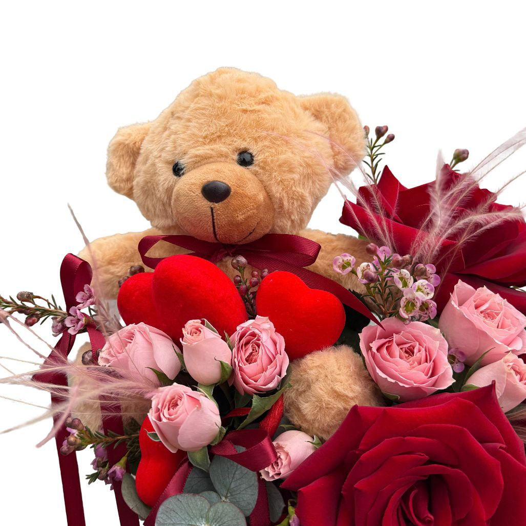 Trandafirii roșii simbolizează dragostea pasională, iar minirosa roz aduce o notă de delicatețe. Wax flower contribuie cu textură, în timp ce stipha completează aranjamentul cu eleganța sa. Ursulețul de pluș crem adaugă o notă de tandrețe, transformând acest cadou într-un mesaj de afecțiune profundă.