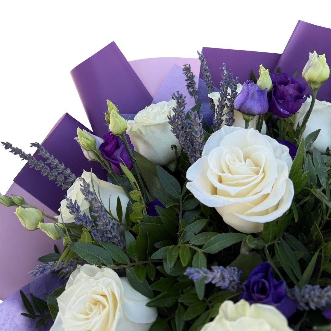 Trandafirii albi Avalanche simbolizează admirația profundă și dragostea pură, în timp ce lisianthusul mov aduce originalitate și frumusețe subtilă. Veronica albă adaugă un element de delicatețe, iar frunzele de salal contribuie la echilibrul vizual al buchetului.