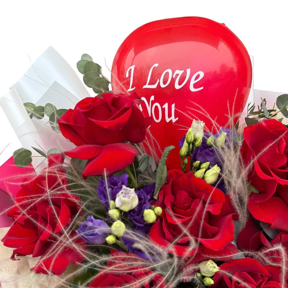 Buchet Te Iubesc! este expresia supremă a iubirii, combinând trandafiri roșii pasionali și lisianthus alb pentru a crea un cadou memorabil și romantic.