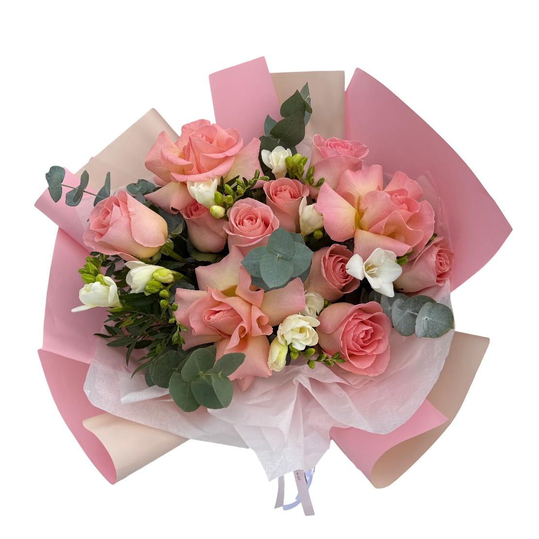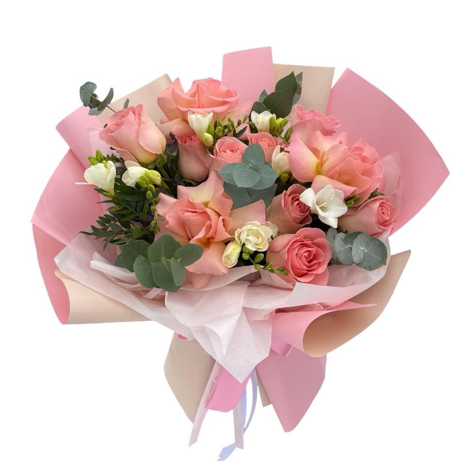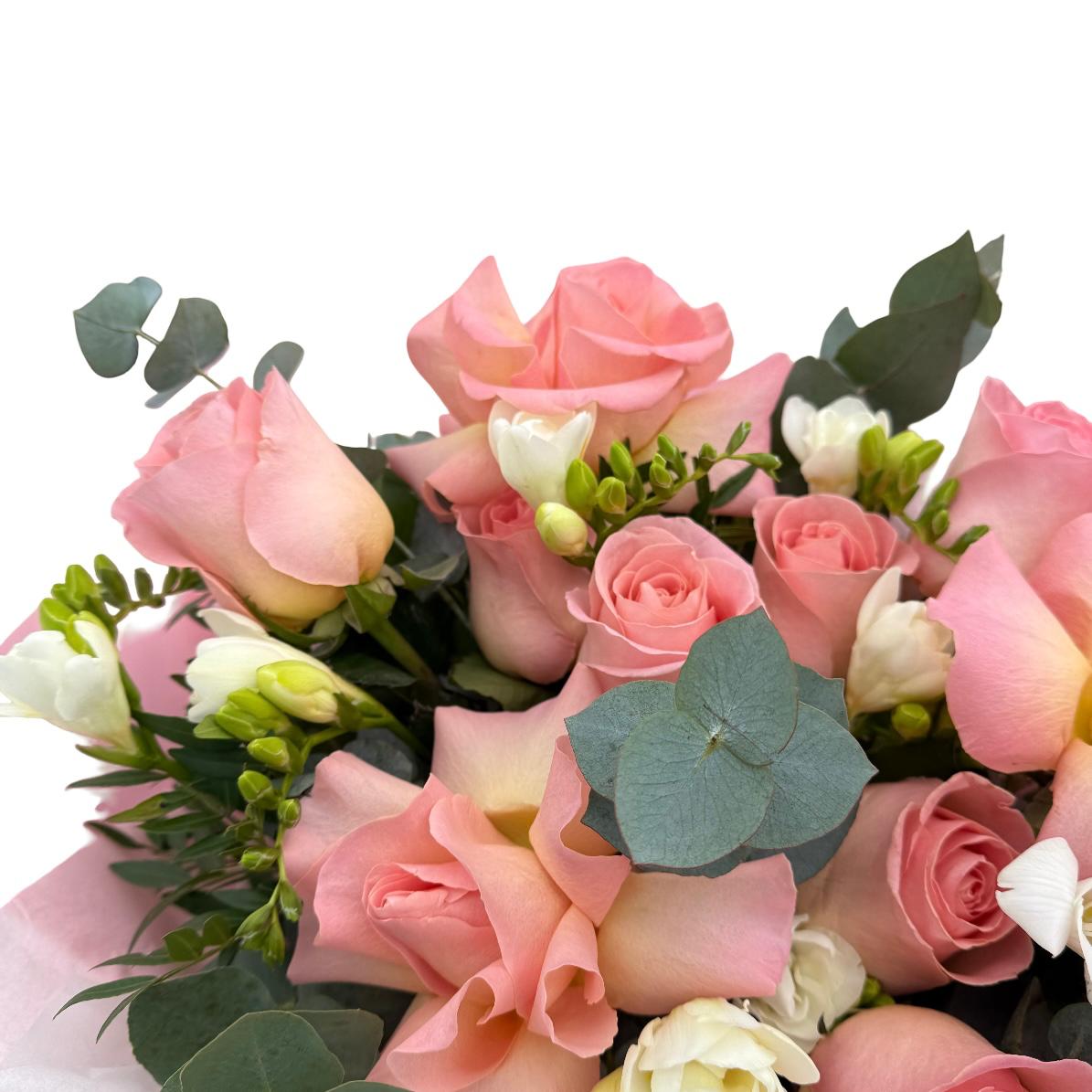 Trandafirii roz simbolizează admirația și recunoștința, făcându-i alegerea ideală pentru a exprima sentimente profunde. Frezia aduce o notă de delicatețe și parfum, fiind apreciată în orice aranjament floral. Aceste flori îmbinate creează o atmosferă de eleganță și rafinament.
