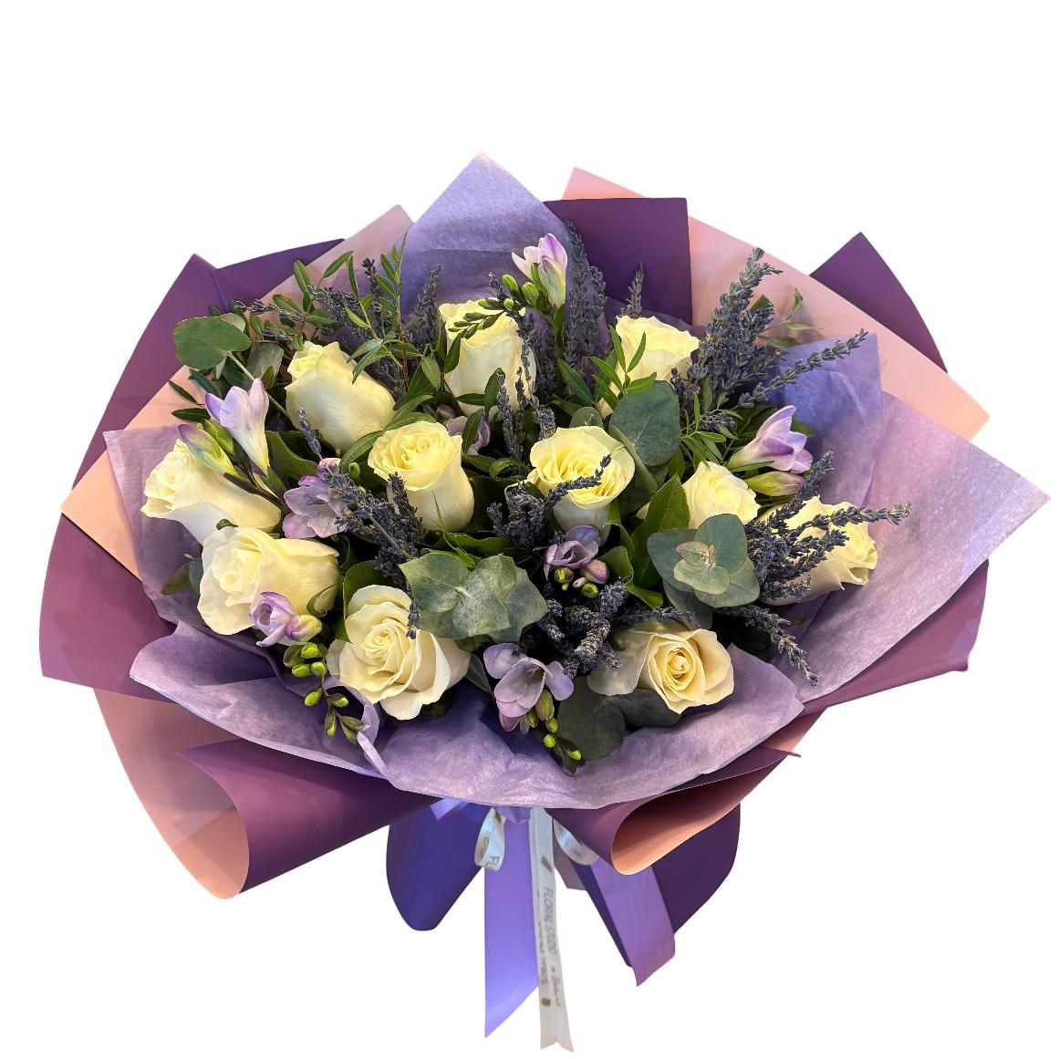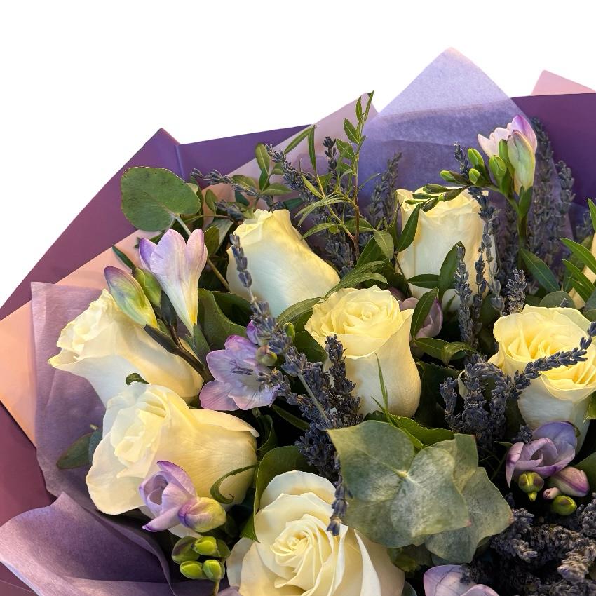 Lavander Purple îmbină frumusețea naturală a trandafirilor albi, a freziilor parfumate și a levănțicii delicate pentru a crea o experiență florală unică. Inspirat de serile calde de primăvară, acest buchet este perfect pentru a aduce un zâmbet pe chipul celor dragi. Fie că îl dăruiești cu ocazia unei aniversări sau pur și simplu pentru a-ți exprima aprecierea, Lavander Purple va transforma fiecare moment într-o amintire specială.