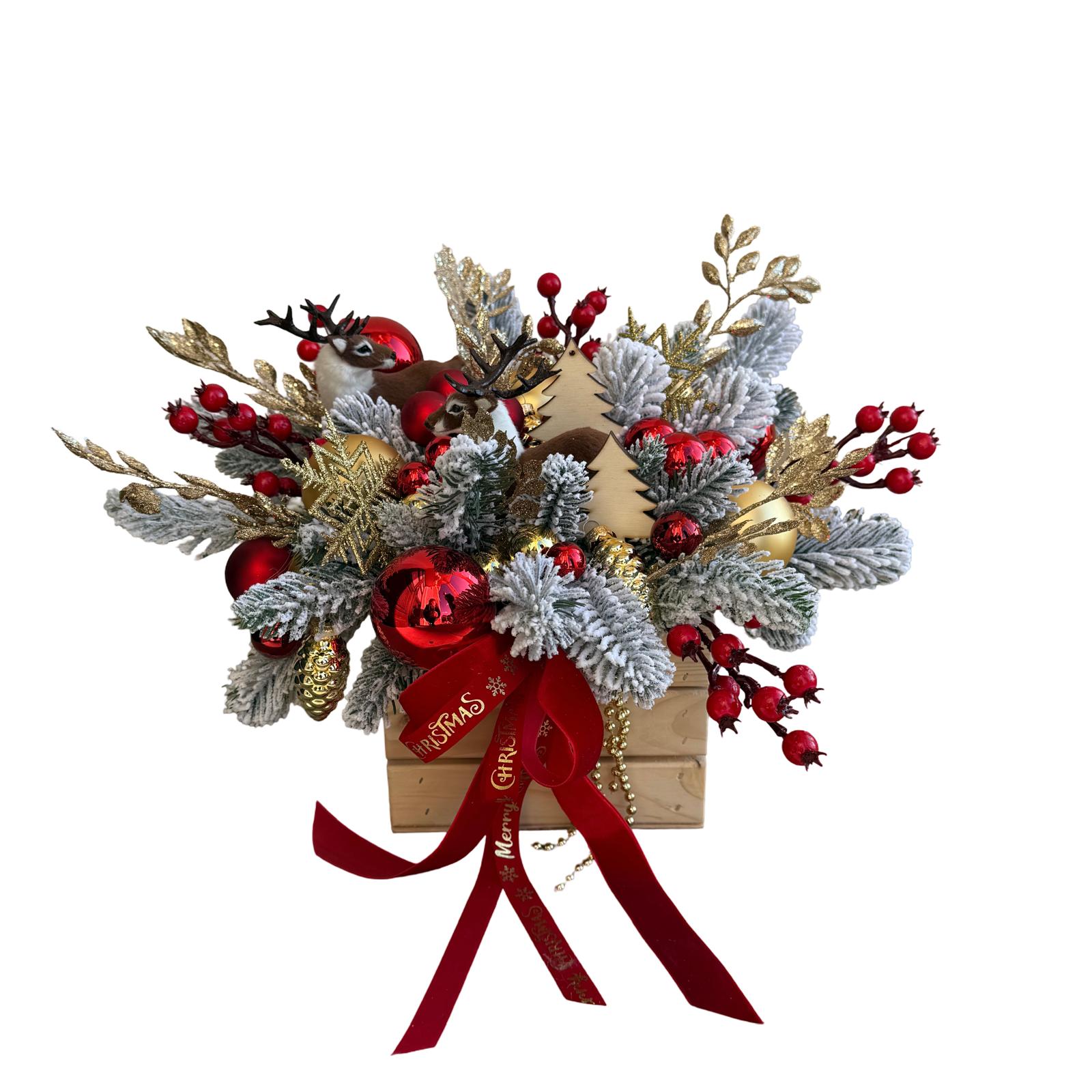 Comandă acum Aranjament în lădiță lemn cu brad artificial și accesoriu cerb și livrează emoție pură!