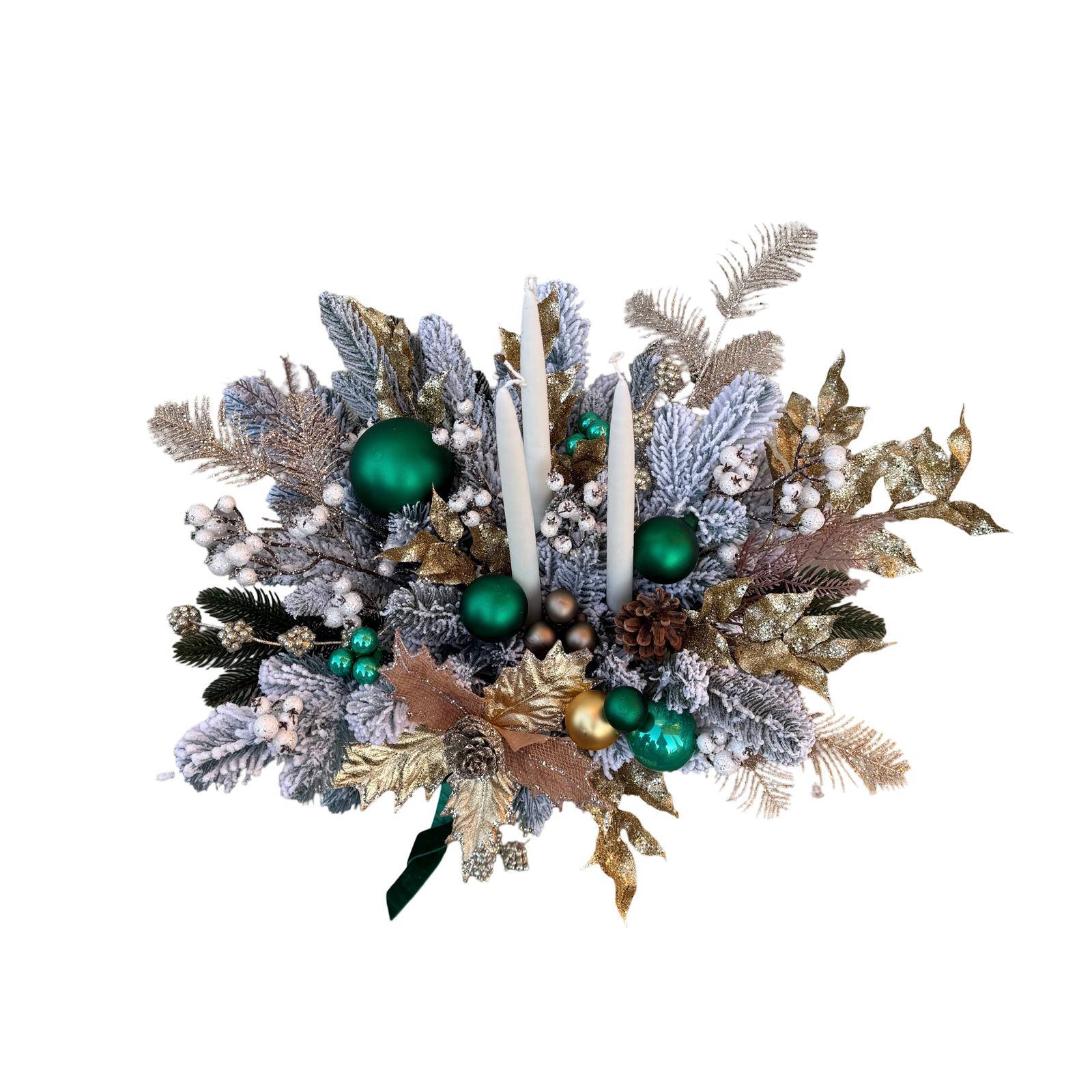 - Globuri sticlă verzi de diferite mărimi: Accesorii decorative care completează cromatica aranjamentului.