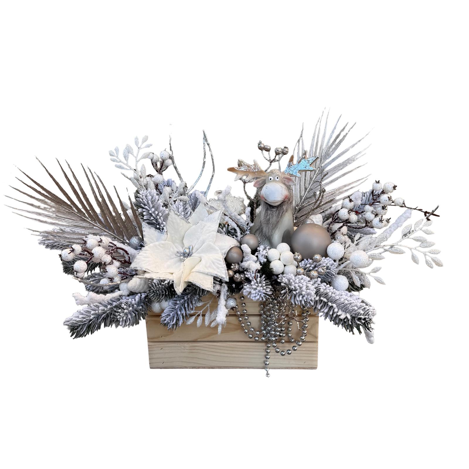 Comandă acum Aranjament silver în lădiță lemn cu brad artificial și figurină Crăciun și livrează emoție pură!