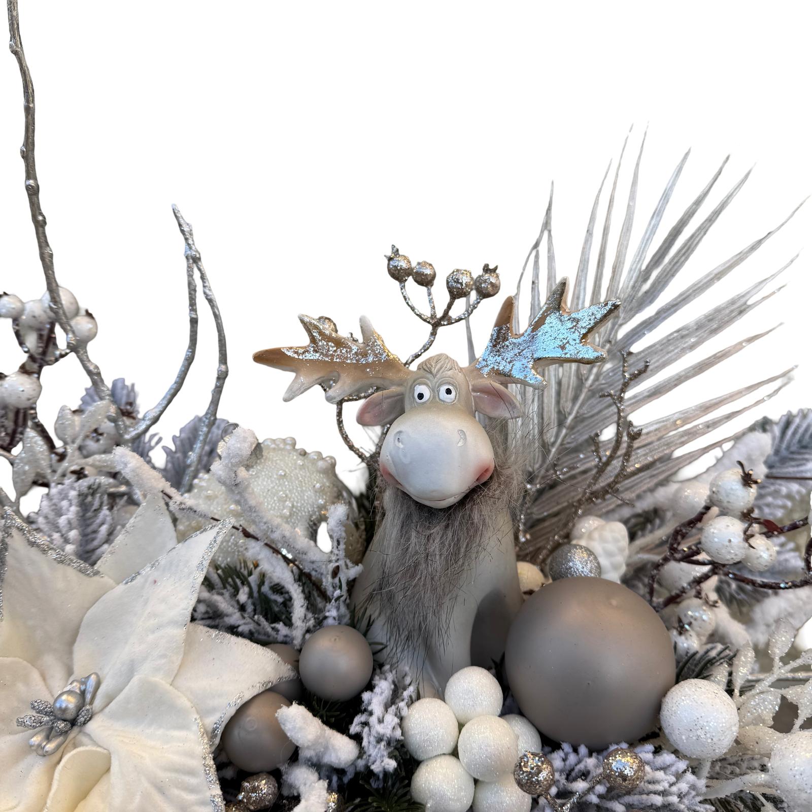 Acest aranjament te transportă direct în atmosfera magică a Crăciunului, inspirat de serile călduroase petrecute alături de cei dragi. Cu fiecare detaliu, de la florile delicate la globurile strălucitoare, te îndeamnă să te bucuri de momentele frumoase ale sărbătorilor. Fie că îl dăruiești cu ocazia unei reuniuni de familie sau îl folosești pentru a decora propria locuință, acest aranjament va aduce un strop de bucurie și amintiri de neuitat.