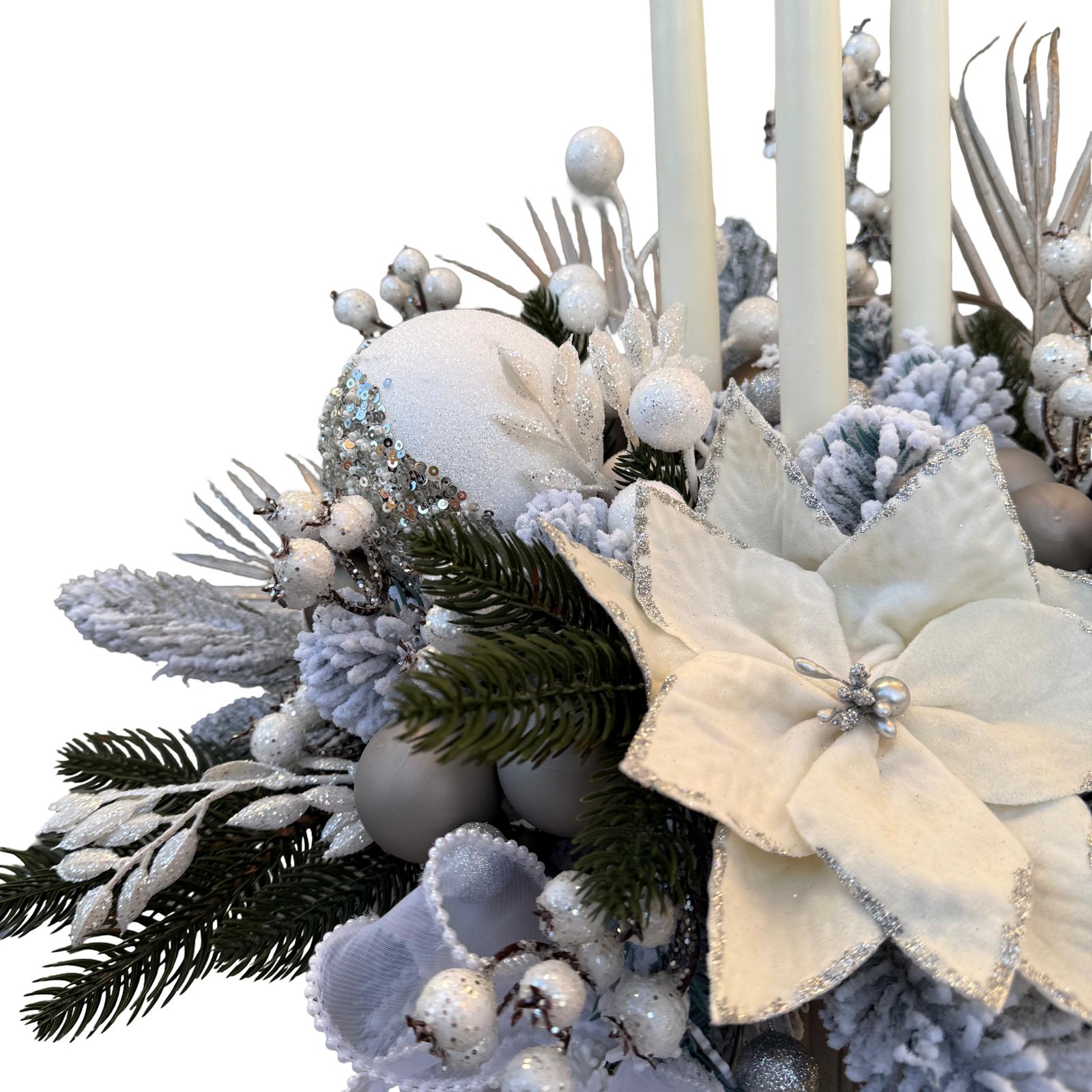 Acest aranjament evocă o atmosferă de sărbătoare, inspirată de serile magice de iarnă. Fie că îl dăruiești cu ocazia Crăciunului sau îl folosești pentru a decora casa, fiecare detaliu este gândit să aducă bucurie și căldură. Imaginează-ți cum lumânările strălucesc în întuneric, iar globurile de sticlă reflectă lumina, creând un spectacol de culori și emoții. Lasă-te purtat de magia acestui aranjament și transformă orice moment într-o amintire de neuitat.