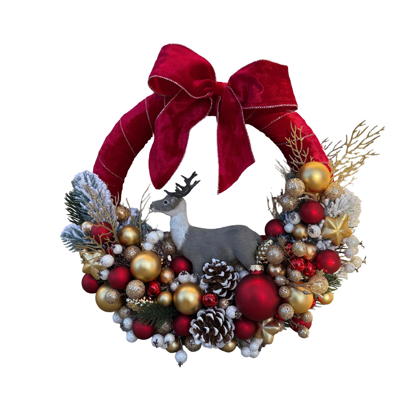 Comandă acum Coroniță cu brad artificial decorată în nuanțe de roșu și auriu și livrează emoție pură!