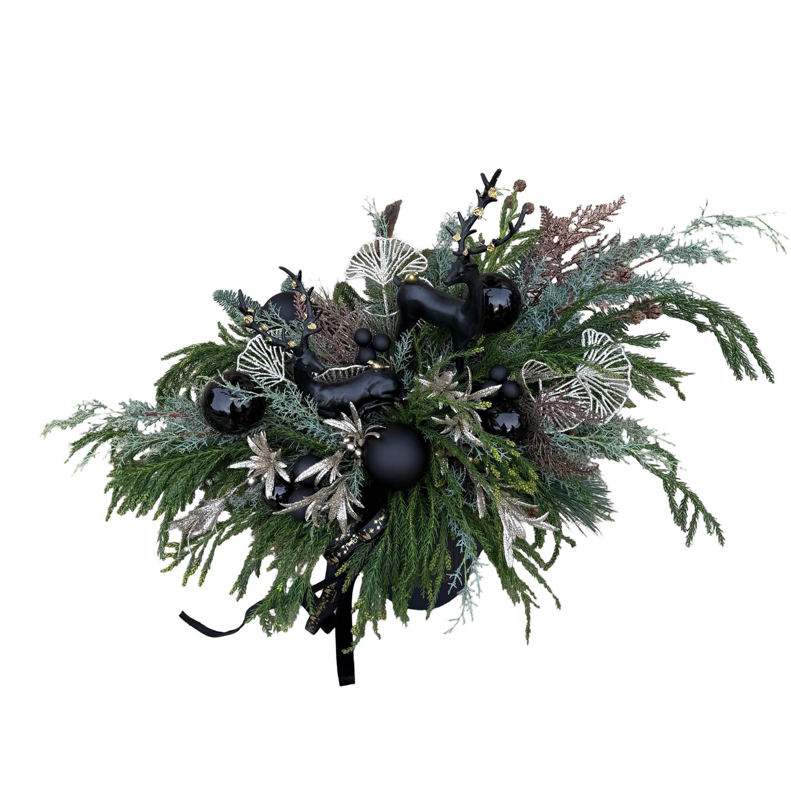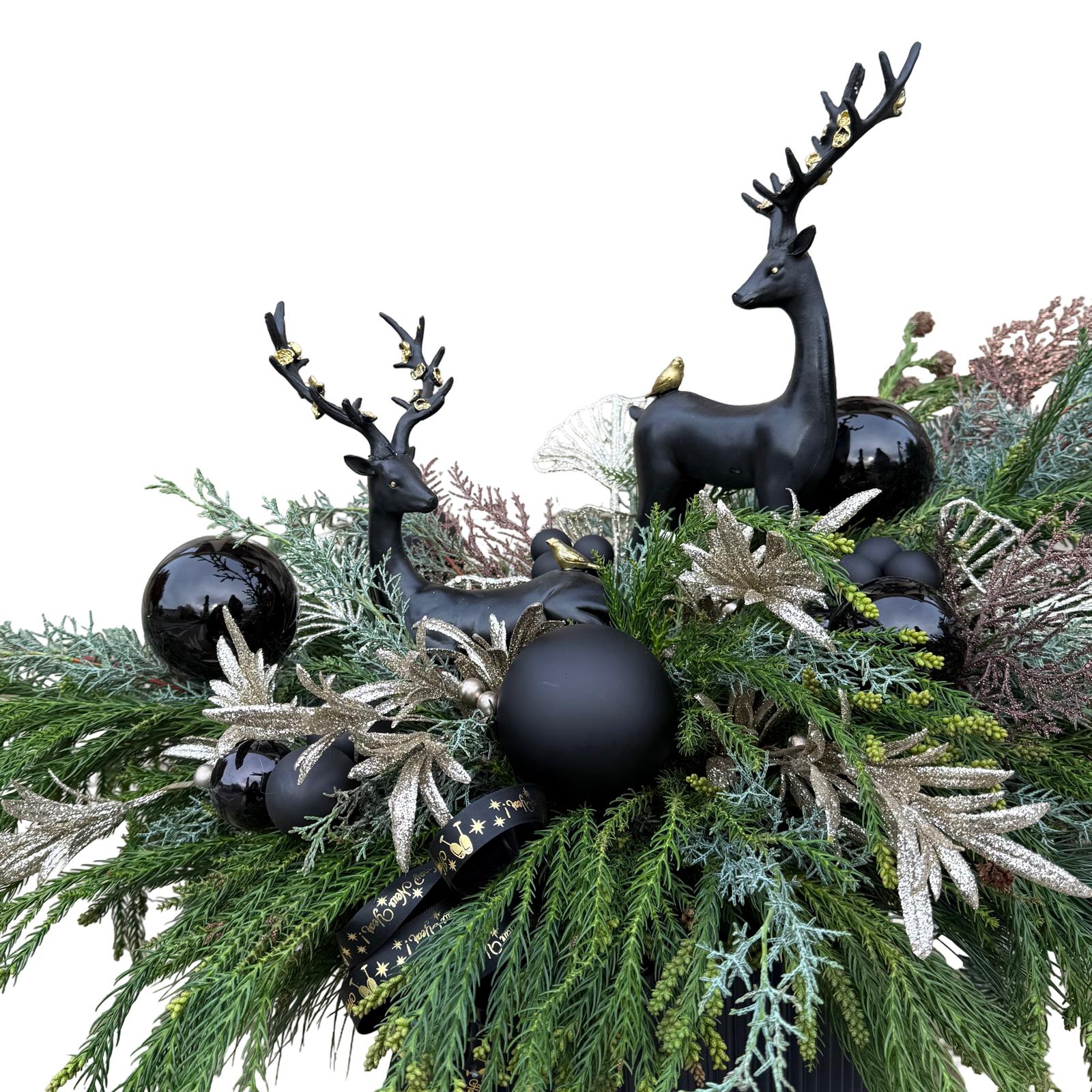 Aranjamentul în vas negru cu brad natural și accesoriu cerb aduce un strop de eleganță și magie în orice încăpere. Acest aranjament inspirat de frumusețea naturii este perfect pentru a sărbători momente speciale, fie că este vorba de Crăciun, o aniversare sau pur și simplu pentru a aduce bucurie în viața ta. Încântă-ți privirea și inima cu acest decor sofisticat, plin de viață și de farmec!