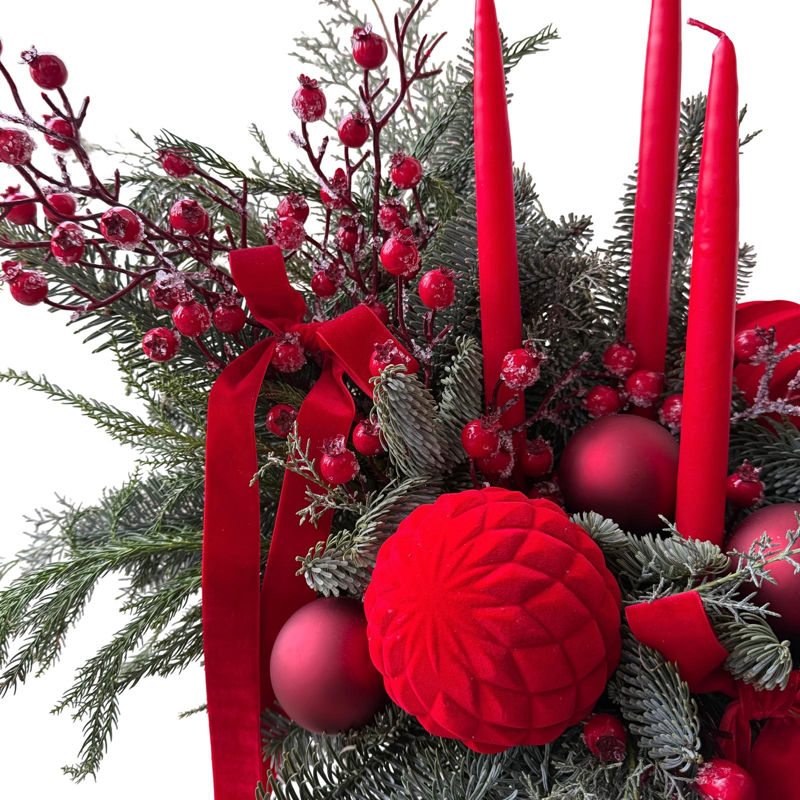 Comandă acum Aranjament roșu cu brad natural, lumânări și fundițe catifea și livrează emoție pură!