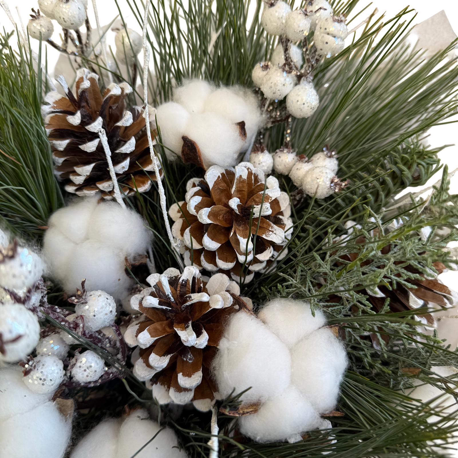 Buchet alb cu bumbac și conuri aduce eleganță și bucurie în fiecare moment special al iernii!