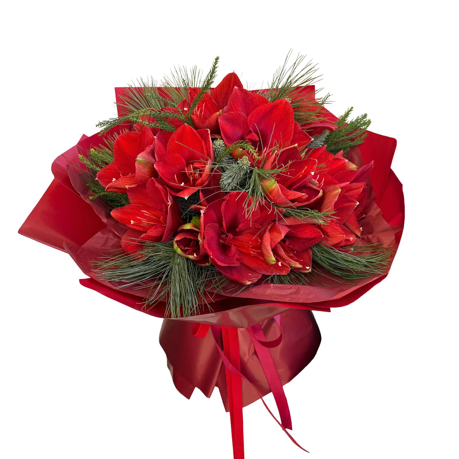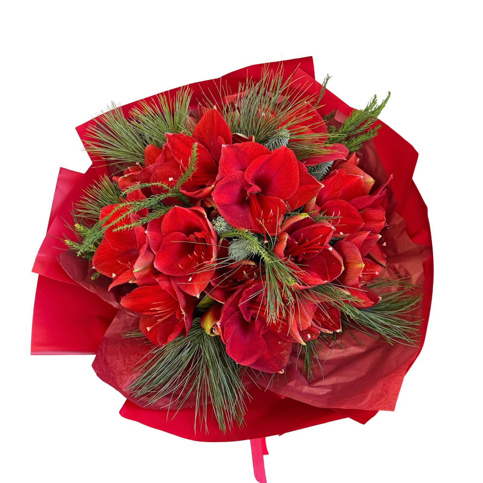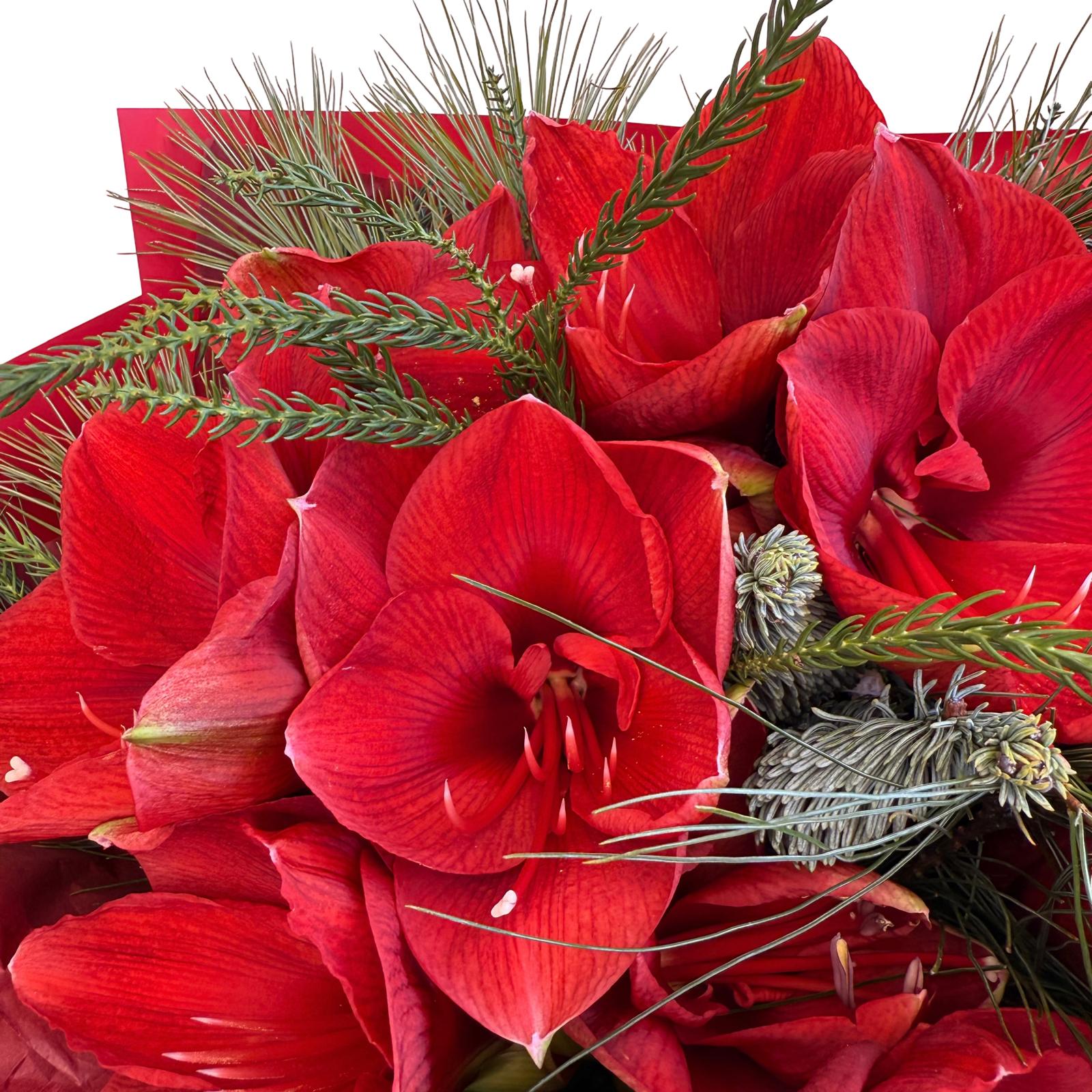 Buchetul Amaryllis roșu este inspirat de intensitatea iubirii și frumusețea naturală a sezonului rece. Fie că îl dăruiești unei persoane dragi sau că alegi să-l folosești pentru a decora propriul spațiu, acest aranjament va aduce cu siguranță un aer sofisticat și cald. Florile roșii intense, combinate cu verdeața coniferelor, creează un contrast perfect, evocând sentimente de bucurie și eleganță.