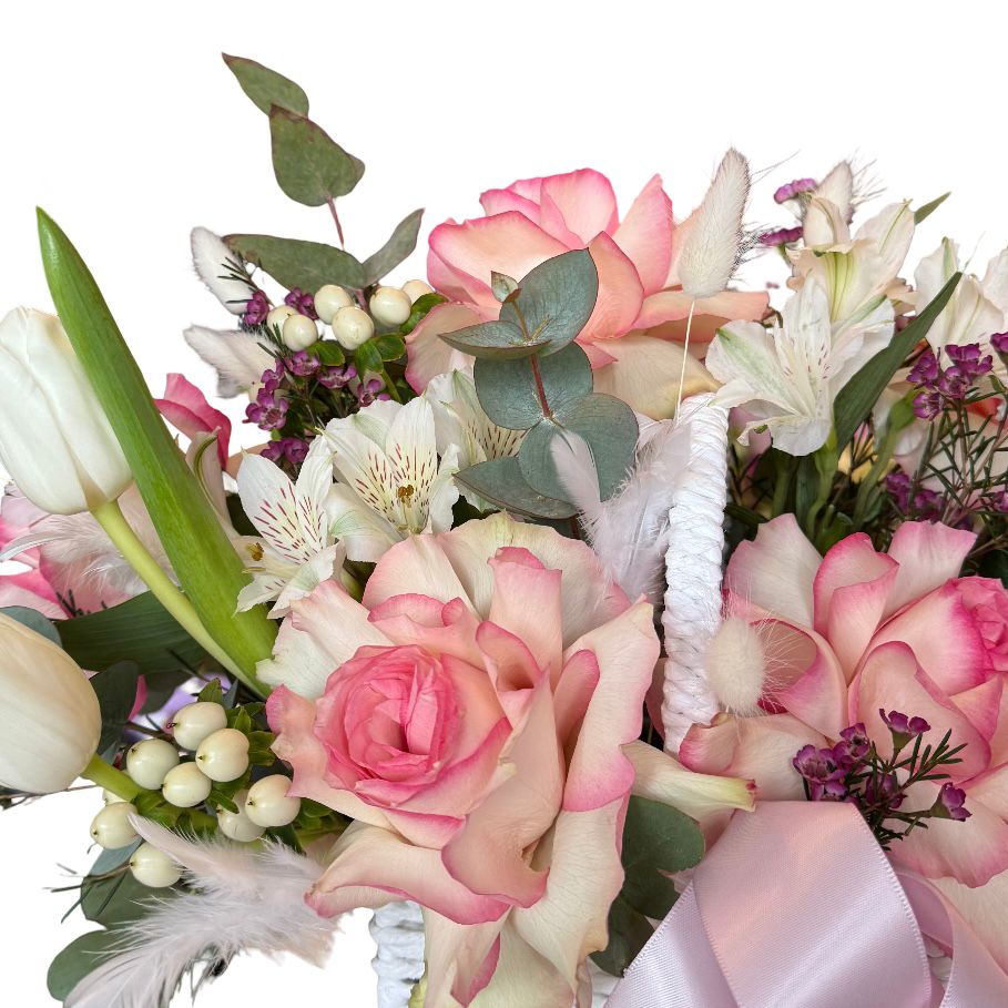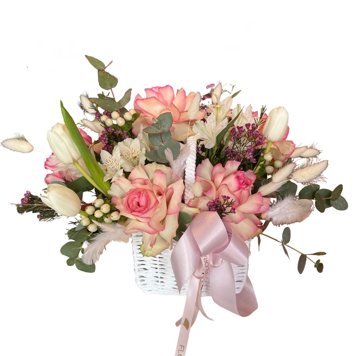 - Prezentare Elegantă: Florile sunt aranjate cu grijă într-un coș decorativ, gata să impresioneze.