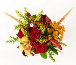 ➤ 7 x Trandafiri roșii ➤ 3 x Protea leucospermum galbenă ➤ 3 x Alstromeria portocalie ➤ 2 x Hypericum roșu➤ 3 x Quercus ruginiu ➤ 4 x Aralia ➤ Verdeață salal ➤ Ambalaj, bandă satin