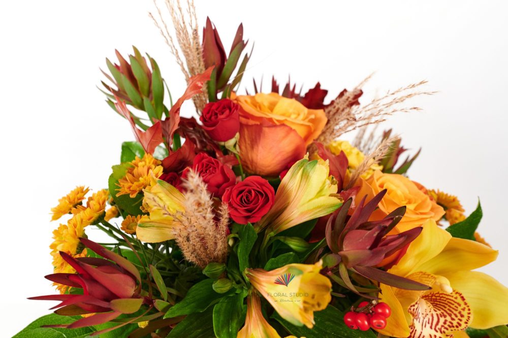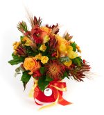 Aranjamentul Îmbrățiăarea Toamnei este un aranjament sofisticat, plin de personalitate, care combină frumusețea exotică a leucadendronului cu protea leucospermum, iar textura diafană a pampasului armonizează complet. Este aranjamentul ideal pentru cine caută un cadou spectaculos, exotic și vibrant.