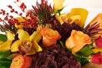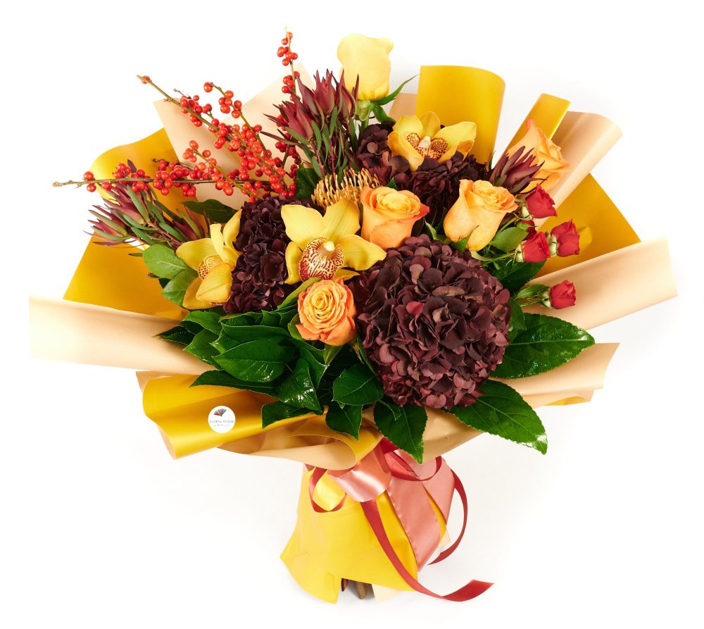 Buchetul Toamnă Aurie este un buchet rafinat, cu o notă festivă, un contrast surprinzător între fructele roșii de Ilex și orhideea cymbidium galbenă, ideal pentru a imresiona și a transmite emoție persoanei dragi.